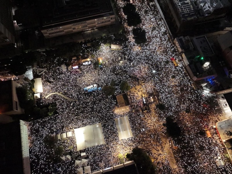 Gösterilerde “Hükümetin rehineleri kurban etmesine izin vermeyeceğiz.” yazılı pankartlar taşınırken, Kanal 12 televizyonu Tel Aviv’deki merkezi mitinge on binlerce kişinin katıldığını duyurdu.