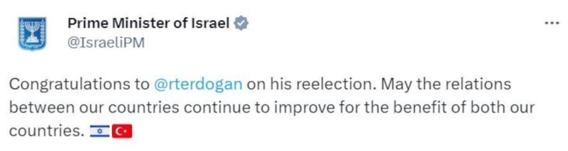 İsrail Başbakanlığı'na ait sosyal medya hesabından, Erdoğan'ın yeniden seçilmesine ilişkin mesaj paylaşıldı.