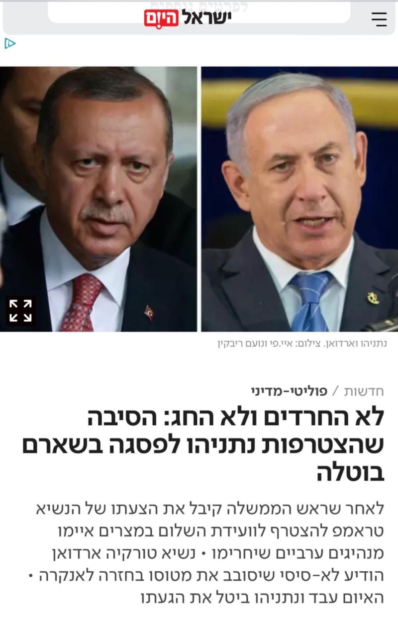 Israel Hayom gazetesine göre, İsrail Başbakanı Binyamin Netanyahu, ABD Başkanı Donald Trump’ın davetiyle Mısır’da düzenlenen zirveye katılmayı kabul ettikten sonra, Cumhurbaşkanı Erdoğan'ın rest çekmesi üzerine katılma kararından vazgeçti.