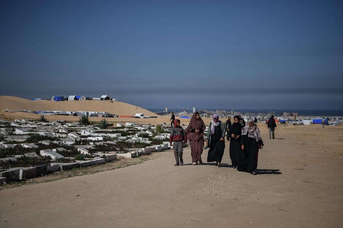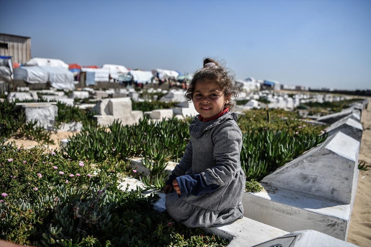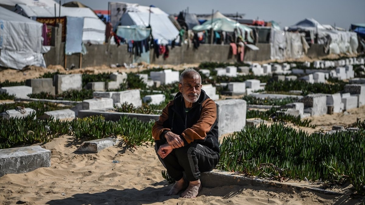 İsrail bombardımanı nedeniyle Gazze'nin farklı bölgelerinden Refah kentine göç eden ve kalacak yer bulamayan Filistinliler, kentte bulunan bir mezarlığın çevresinde kurdukları derme çatma çadırlarda zor şartlar altında yaşam mücadelesi veriyor.