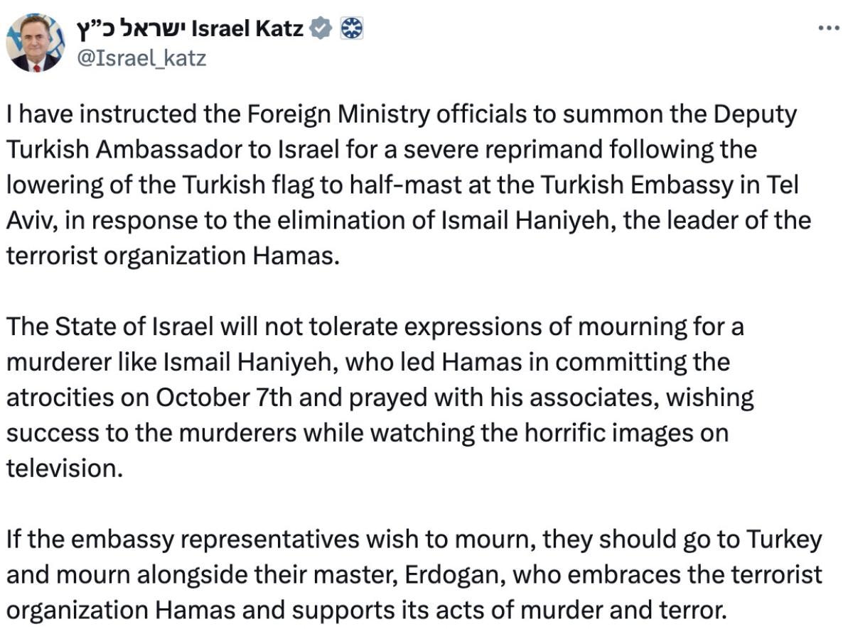 Katz paylaşımında, "Dışişleri Bakanlığı yetkililerine, İsrail'in lideri İsmail Heniyye'nin ortadan kaldırılmasına tepki olarak Tel Aviv'deki Türkiye Büyükelçiliği'nde Türk bayrağının yarıya indirilmesinin ardından Türkiye'nin İsrail Büyükelçi Vekili'ni ağır bir kınama için çağırmaları talimatını verdim." dedi.