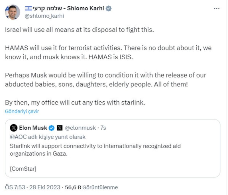 Elon Musk'ın bu hamlesi İsrail hoşuna gitmedi. İsrail İletişim Başkanı Shlomo Karhi, Elon Musk'ın Gazze için Starlink kararı sonrası sosyal medya platformu X'ten yaptığı açıklamada şu sözleri sarfetti: