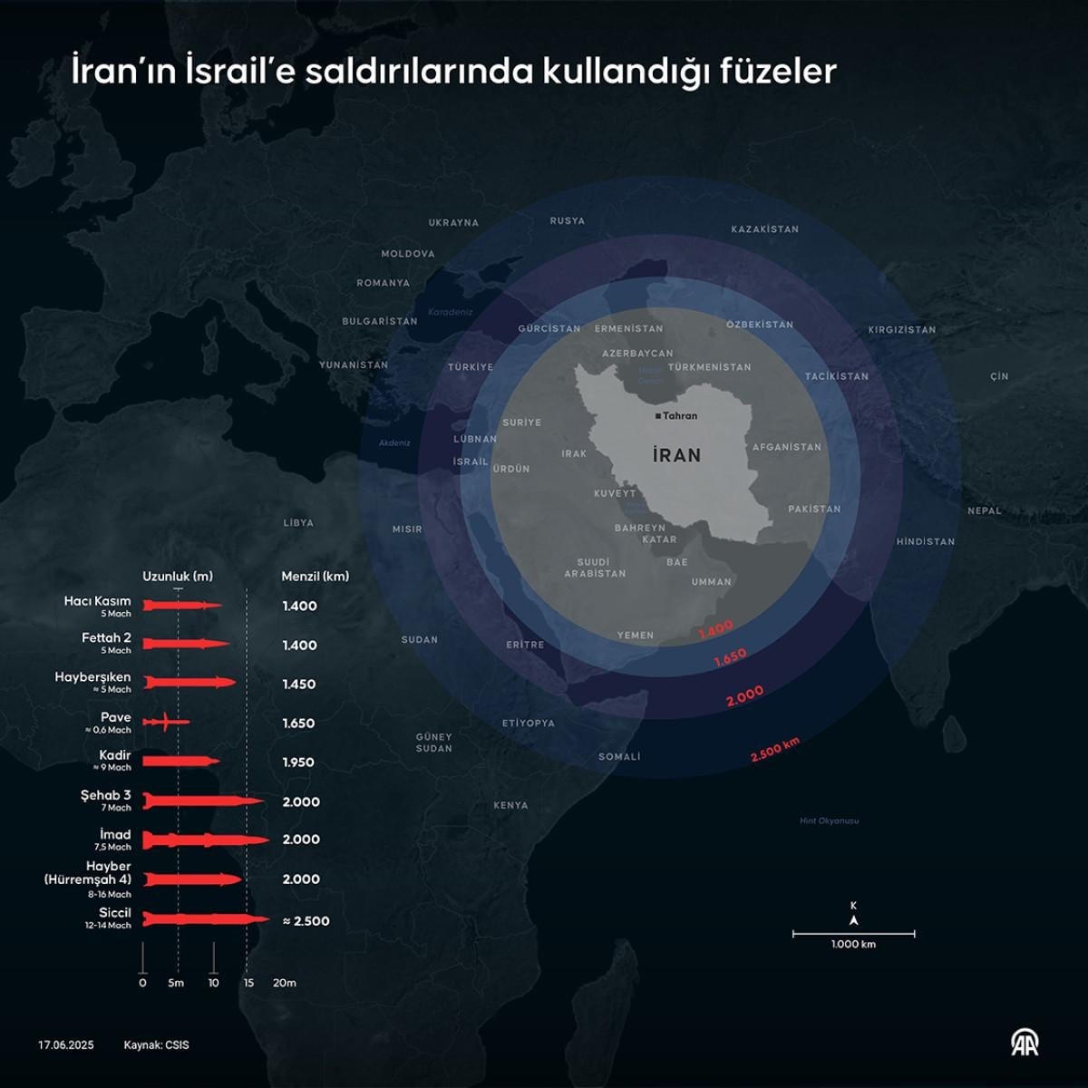 Öte yandan İran kaynaklarına göre, İsrail’e misillemelerde 1400 ila 2500 kilometre menzilli hipersonik ve süpersonik ile uzun menzilli füzeler kullanıldı.