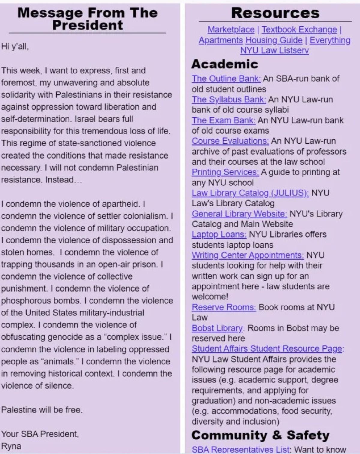Öte yandan NYU Öğrenci Barosu, Workman dışındaki üyelerinin "bu mesajı yayınlanmadan onaylamadığını ve görmediğini" kaydetti.