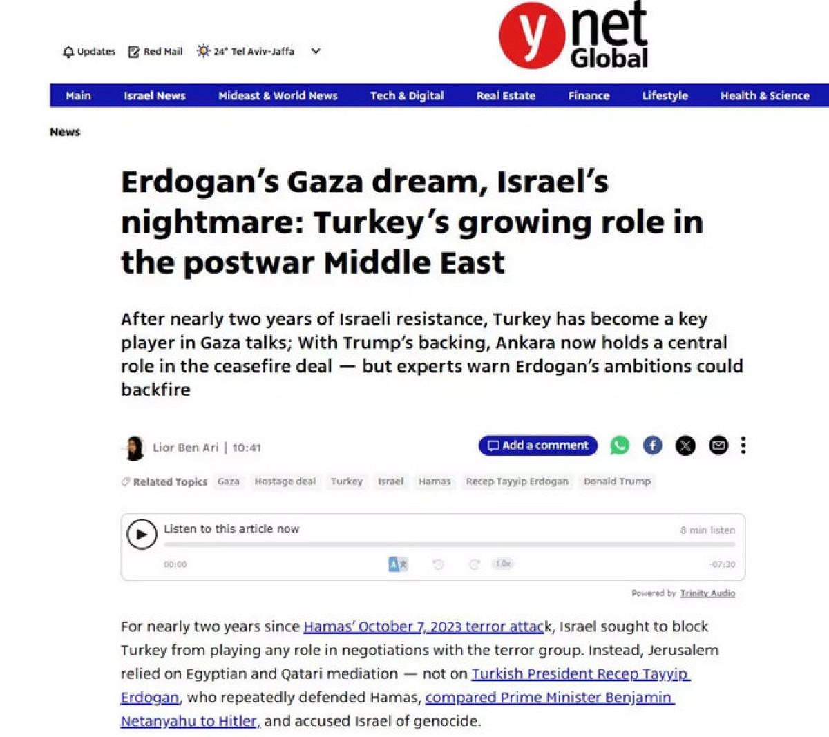 İsrailli yazar Lior Ben Ari, 18 Ekim 2025’te YNet Global’de yayımladığı “Erdoğan’ın Gazze Rüyası, İsrail’in Kabusu: Türkiye’nin Savaş Sonrası Orta Doğu’daki Artan Rolü” başlıklı makalesinde, Türkiye’nin bölgedeki etkisinin giderek güçlendiğine dikkat çekti.