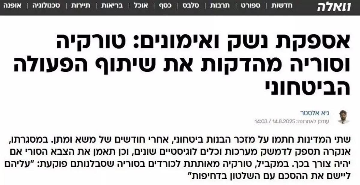 Walla haber sitesi ise manşetinde "Türkiye ve Suriye güvenlik iş birliğini sıkılaştırıyor" başlığını kullandı. Haberde, Türkiye ve Suriye'nin, aylar süren müzakerelerin ardından bir güvenlik muhtırası imzaladığı belirtildi.