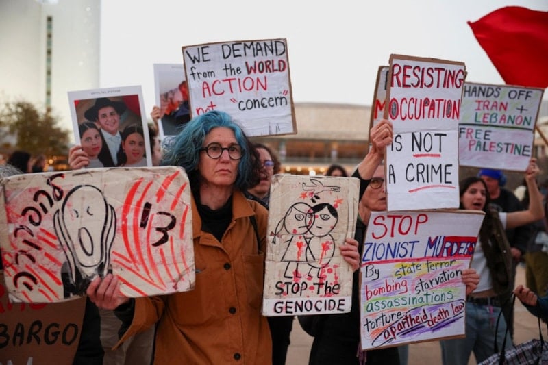 Göstericiler, ABD-İsrail saldırılarını hedef alan dövizler taşırken İsrail Başbakanı Binyamin Netanyahu aleyhine slogan atarak Gazze'de işlenen soykırıma da tepki gösterdi.