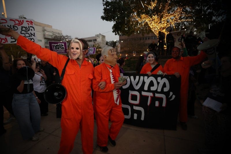 Onlarca İsrailli, saldırıları protesto ederek bölgede savaşın sona ermesi çağrısında bulundu. Protestocuların bir kısmı Netanyahu’nun yanı sıra Donald Trump maskeleri taktı.
