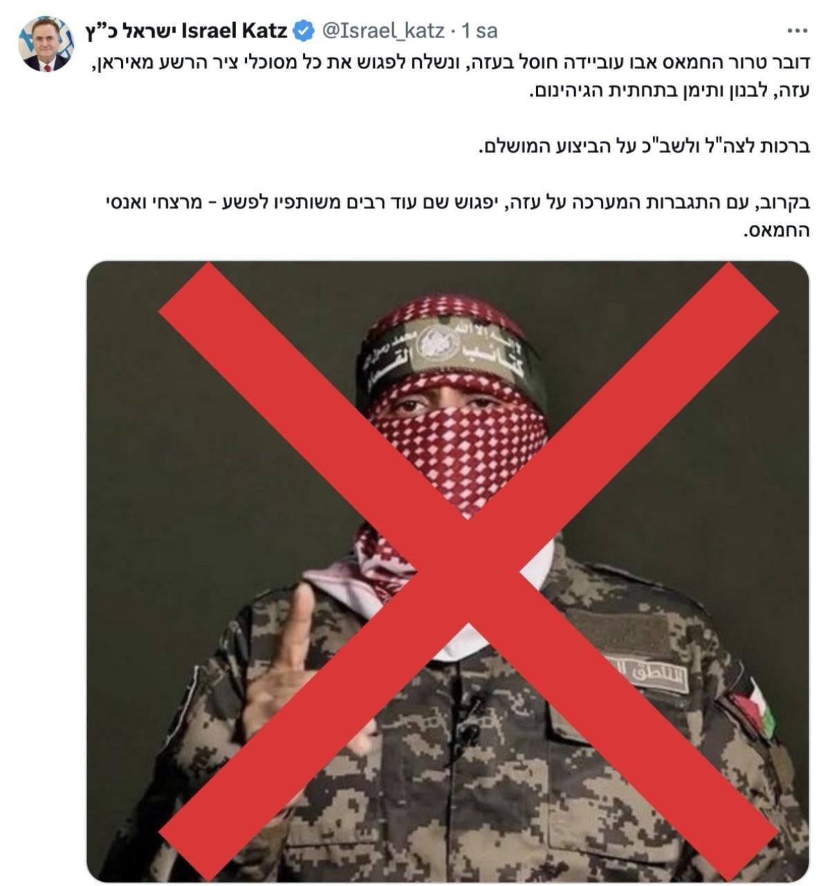 İsrail Savunma Bakanı Yisrael Katz, ABD merkezli X sosyal medya platformundaki hesabından yaptığı paylaşımda, fotoğrafını paylaştığı Kassam Tugayları Sözcüsü Ebu Ubeyde'yi öldürdüklerini savundu.