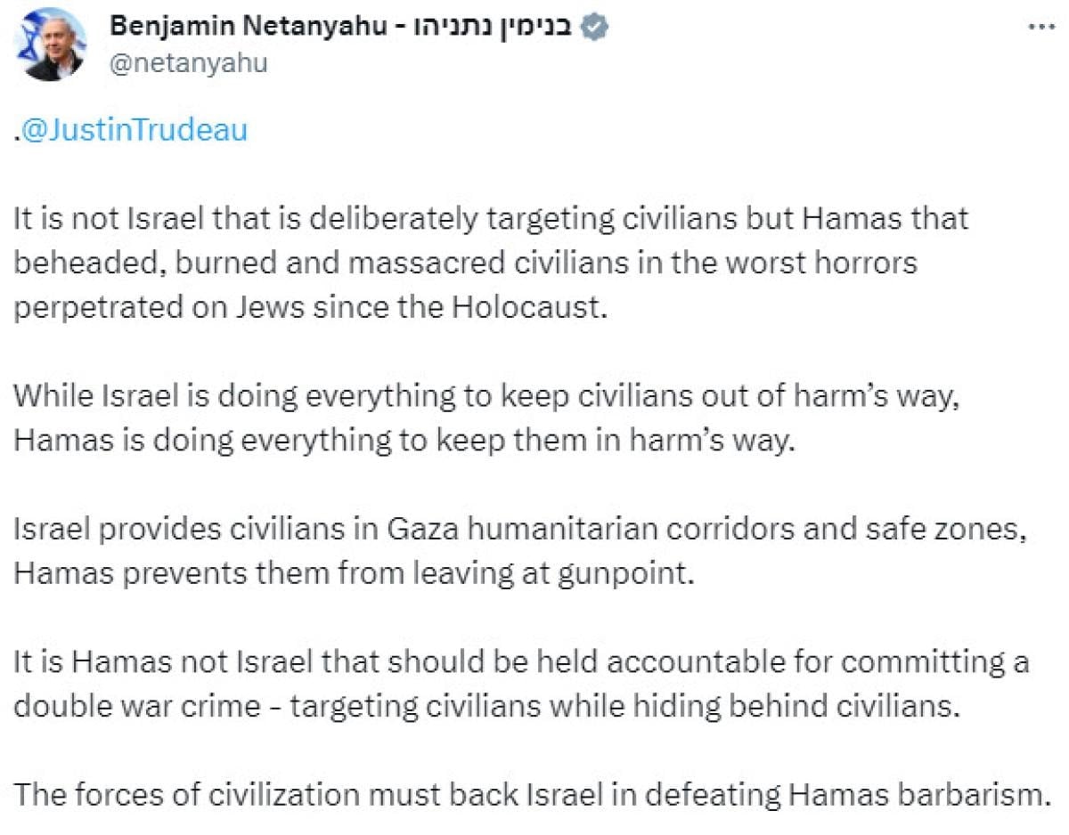 Sivilleri zarardan uzak tutmak için "her şeyi" yaptıklarını savunan Netanyahu, "Hamas ise onları zarara uğratmak için her şeyi yapıyor." diye yazdı.