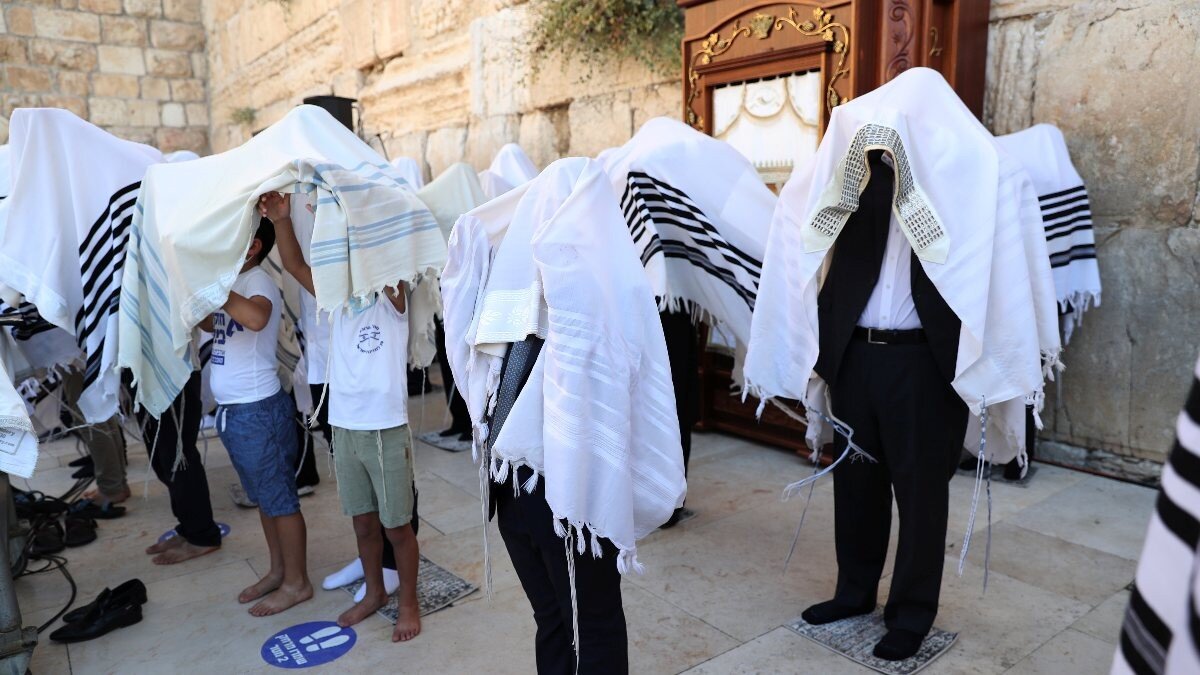 Koronavirüs nedeniyle maske takan Yahudiler, dua sırasında şal kullandı.