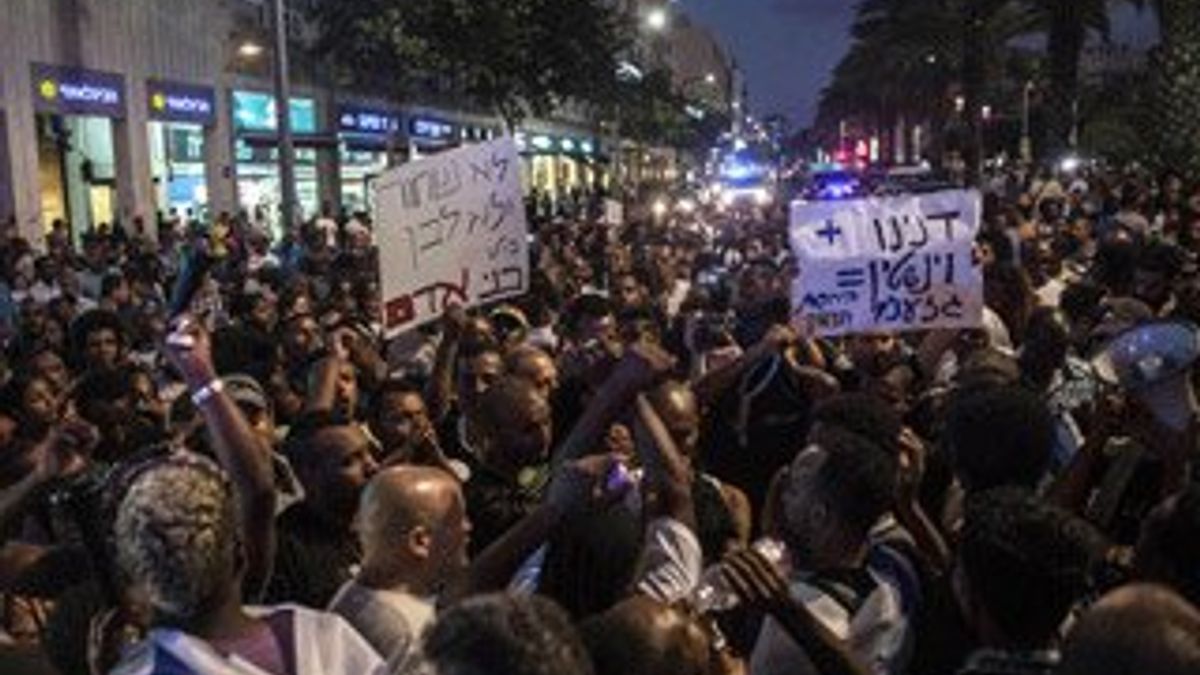 Şehrin en işlek yerlerinden Rabin Meydanı'nda toplanan yüzlerce gösterici, Mayıs ayında Etiyopyalı bir askeri döven polislerden henüz hesap sorulmamış olmasına tepki gösterdi.