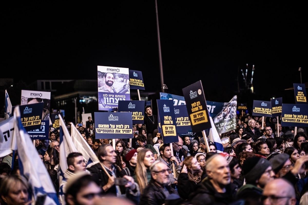 Hamas ile İsrail arasında Gazze'de bir ateşkes ve karşılıklı esir takasını öngören bir anlaşmaya karşı çıkan göstericiler, "Sadece Hamas'ın üzerinde askeri baskı esirleri getirebilir", "Netanyahu seninleyiz, git kazan", "Hamas'a yakıt yok", yazılı dövizler, afişler, İsrail bayrakları, İsrail ordusunun Gazze'deki kara işgali sırasında hayatını kaybeden askerlerin resimlerini taşıdı.