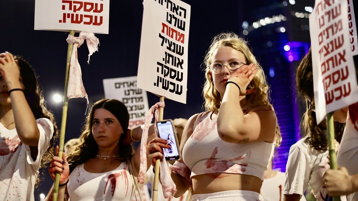 Esirlerin bir an önce evlerine dönmesi çağrısı yaparak davullar ve düdükler çalan protestocular, "Hepsi hemen eve!", "istifa şimdi" yazılı dövizler taşıdı, Netanyahu'yu suçlayan sloganlar attı. Göstericiler, "Netanyahu esirleri serbest bırak!", "Sen baştasın, sen suçlusun", "Kanlı başbakanın elinde kan var" diye bağırdı.