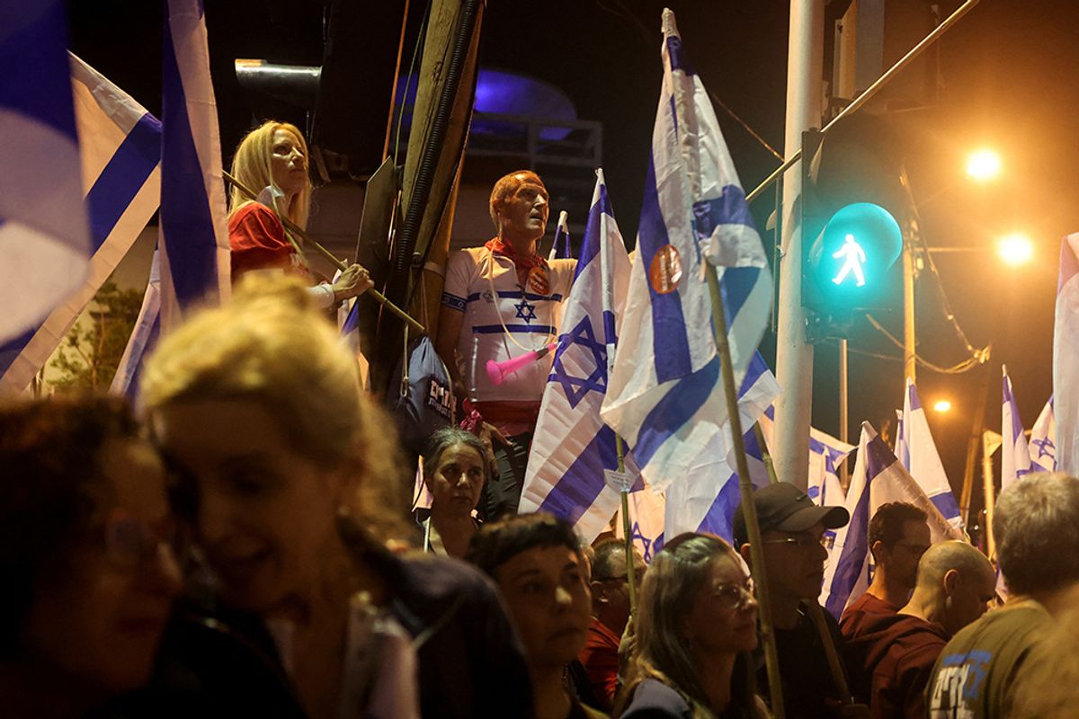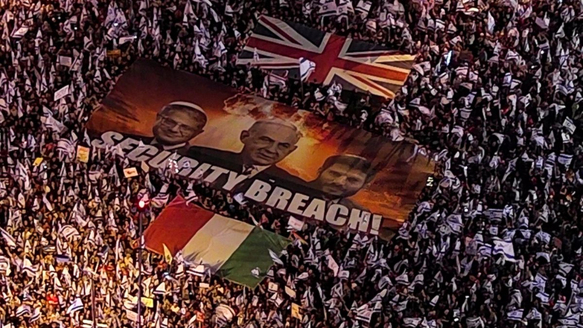 Ellerinde İsrail bayraklarıyla sık sık "demokrasi" sloganları atan göstericiler, koalisyon hükümetindeki aşırı sağcı politikacıları eleştiren dövizler taşıdı.
