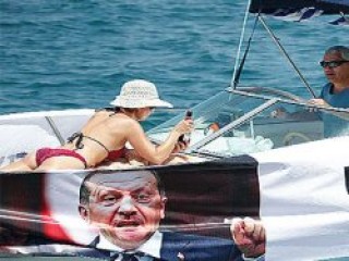 Protestocular yatlarına, Başbakan Recep Tayyip Erdoğan'ın ve İran Cumhurbaşkanı Ahmedinecad'ın fotoğraflarını kullanarak "Erdoğan = Ahmedinecad", "Türkiye = İran" pankartları astı.