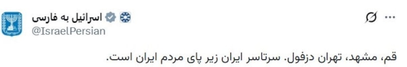 İsrail Dışişleri Bakanlığı’na ait "IsraelPersian" adlı X hesabından yapılan Farsça paylaşımda, gösterilerin sürdüğü şehirlere atıfta bulunularak, "Kum, Meşhed, Tahran, Dezfulİran’ın tamamı İran halkınındır" ifadeleri kullanıldı.