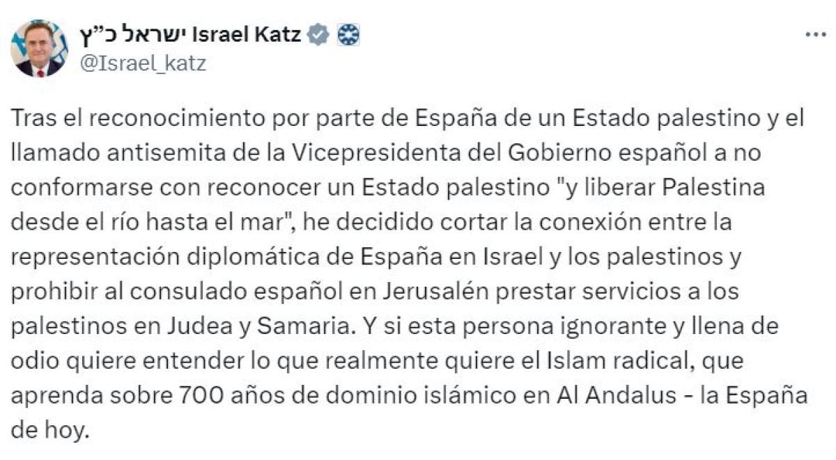 İsrail Dışişleri Bakanı Israel Katz, Kudüs'teki İspanyol konsolosluğunun artık Batı Şeria'daki Filistinlilere hizmet vermeyeceğini söyledi: