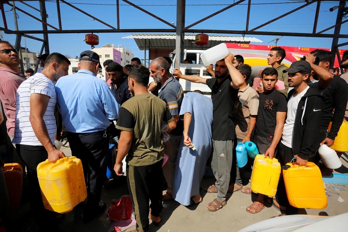 Gazze'nin Deyr Belah kentindeki Filistinliler, yakıt tedarik edebilmek için bir benzin istasyonu önünde kuyruk oluşturdu.