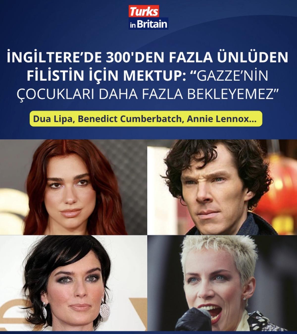 Turks in Britain'de yer alan habere göre, aralarında şarkıcı Dua Lipa, oyuncu Benedict Cumberbatch, eski futbolcu ve televizyon yorumcusu Gary Lineker ile şarkıcı Annie Lennox'un da bulunduğu 300'den fazla ünlü, İngiltere hükümetine açık mektup yazdı.