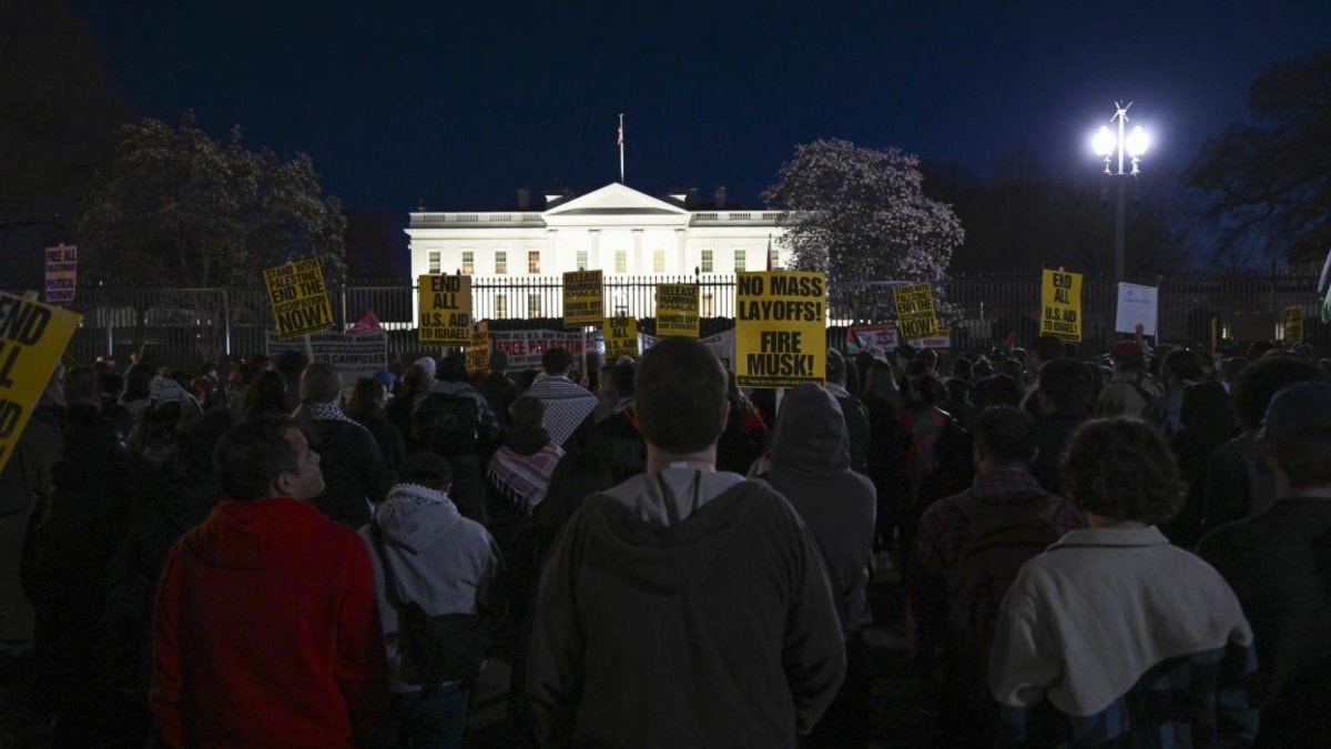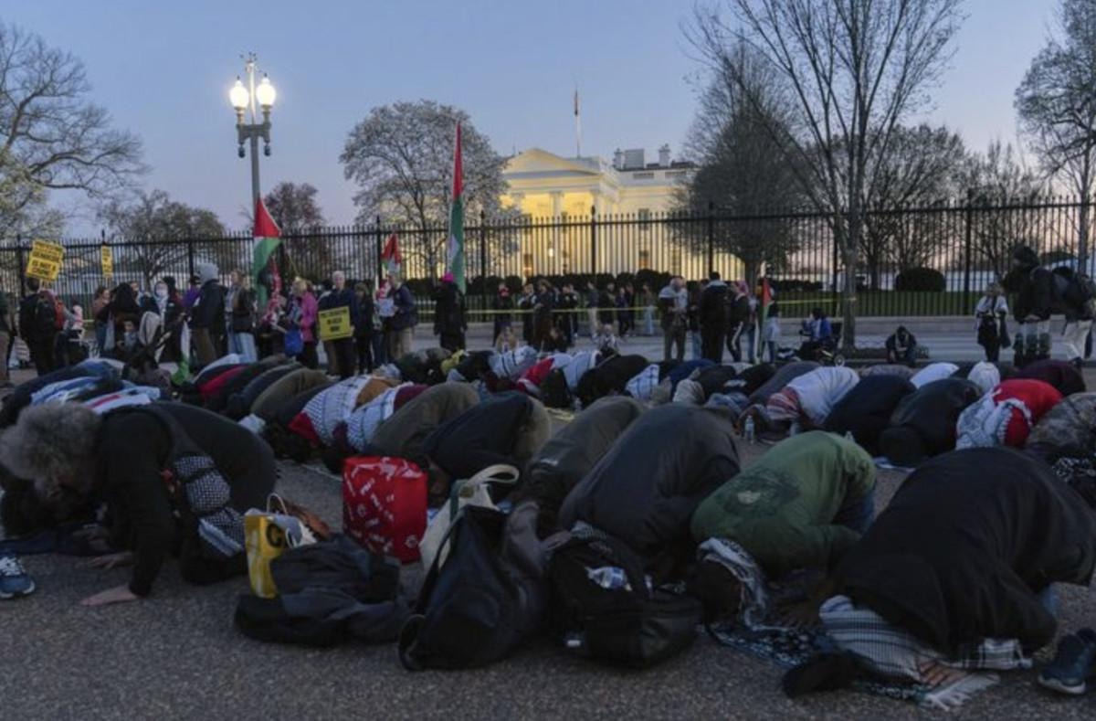 Kefiye giyen ve Filistin bayrakları taşıyan çok sayıda protestocu, Beyaz Saray önünde toplandı.