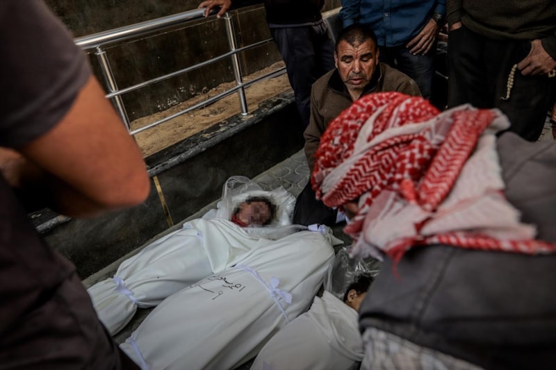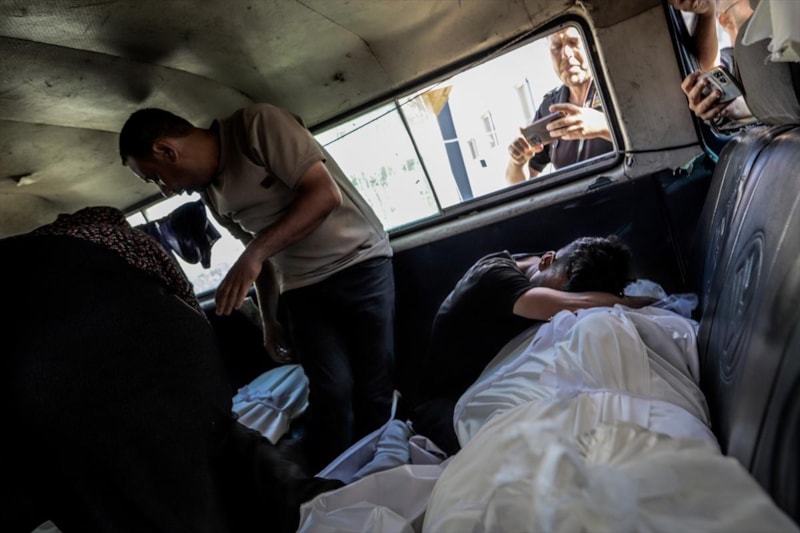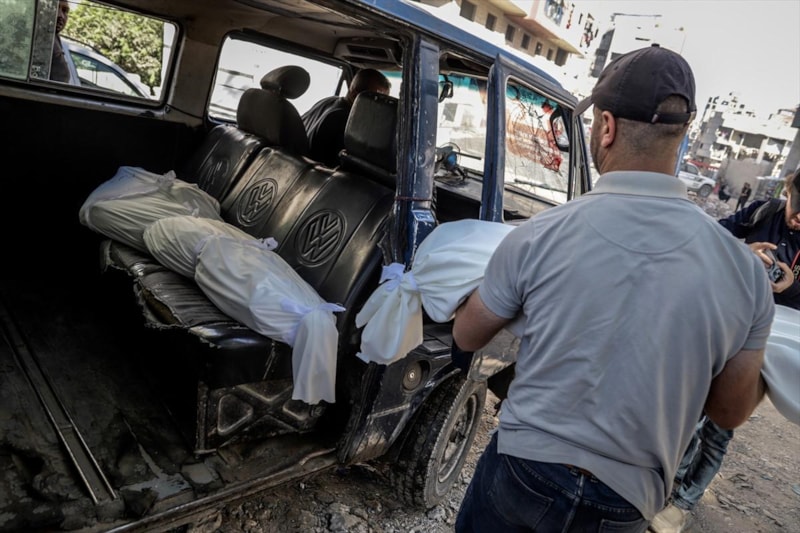Saldırıda aralarında çocukların da olduğu yaşamını yitirenlerin naaşları, cenaze işlemleri için Gazze kentindeki Şifa Hastanesi'ne getirildi.
