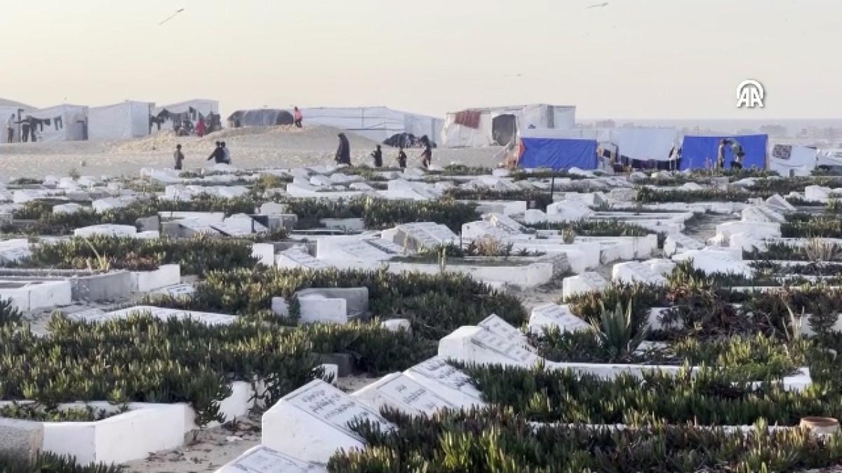 Refah'ta bulunan kamplarda yer bulamayan aile, kentteki mezarlığın yanına kurdukları derme çatma çadırlara sığınmaya mecbur kaldı.