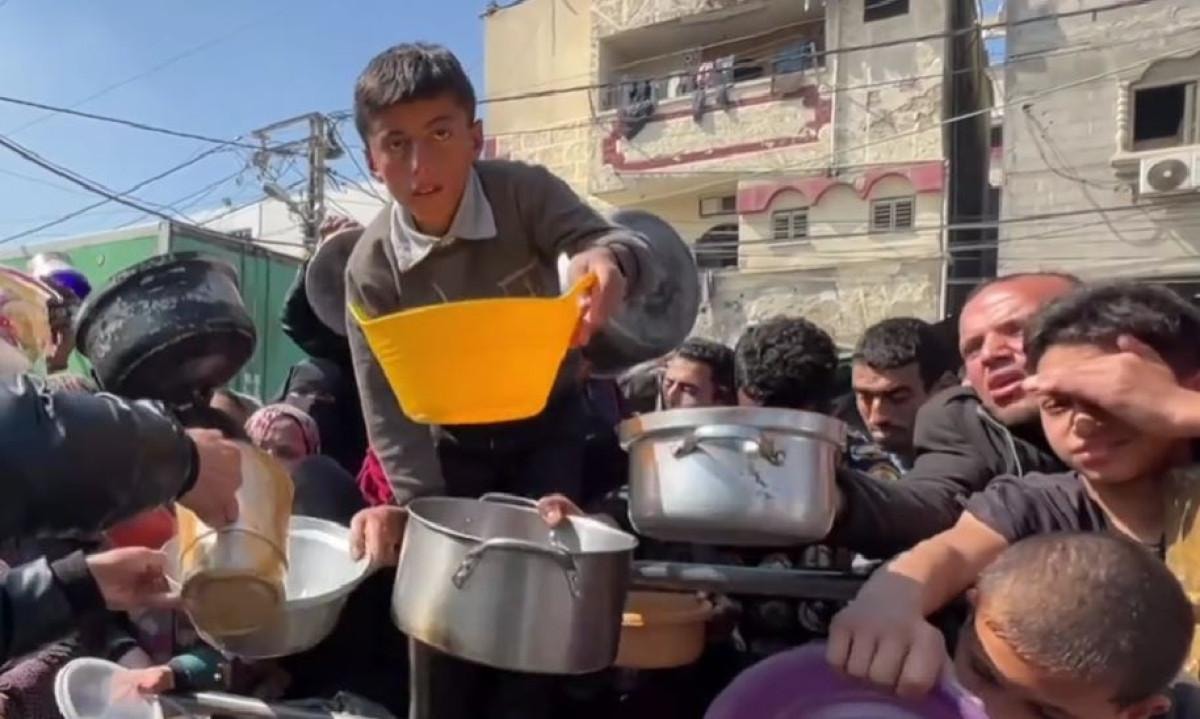 Filistinliler, sığındıkları noktalarda yaşam mücadelesi verirken, ellerindeki kaplarla ailelerine yemek götürebilmek için koşturuyor.