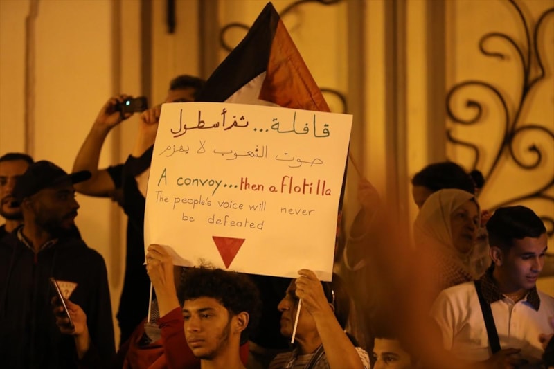 Libya'nın başkenti Trablus'ta, Gazze'deki ablukayı kırmak ve insani yardım ulaştırmak amacıyla Gazze'ye doğru yol alan Küresel Sumud Filosu'na İsrail tarafından yapılan saldırılar protesto edildi.