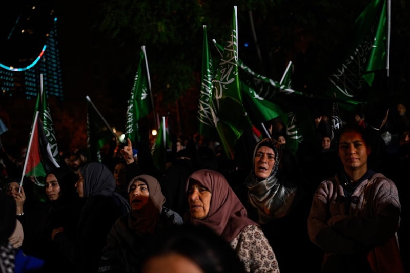 Filistin bayrakları ve pankartlarla gösteriye katılanlar, saldırıya tepki göstererek İsrail karşıtı sloganlar attı.