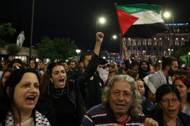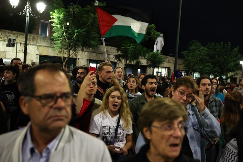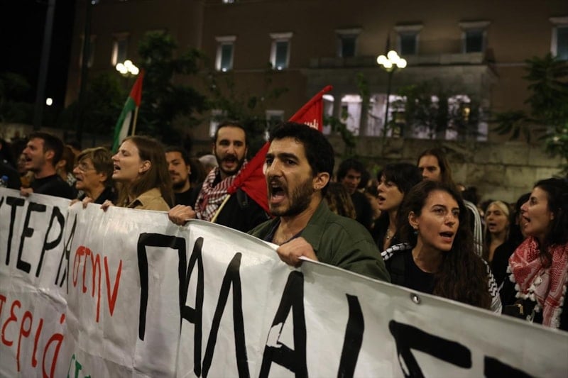 Yunanistan Dışişleri Bakanlığı binası önünde toplanan eylemciler, "Filistin'e özgürlük" sloganları atarak İsrail'in Küresel Sumud Filosu'na saldırısını kınadı.