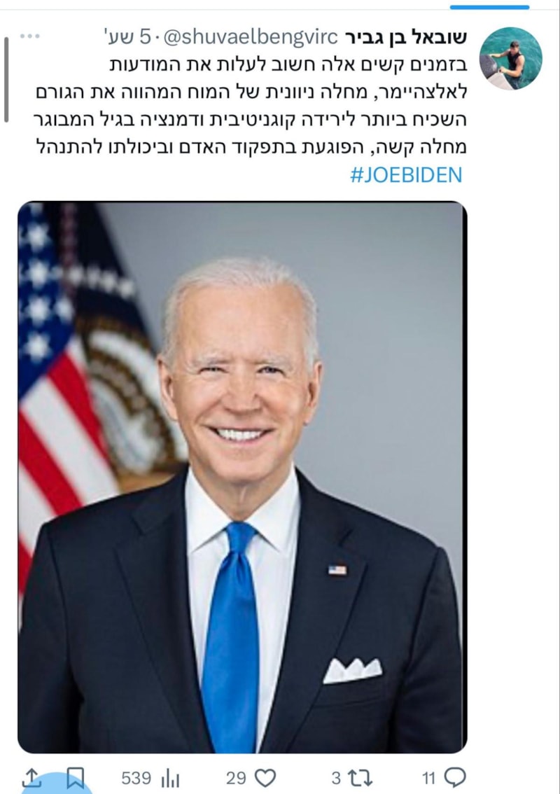 Shuvael Ben-Gvir, Biden'ın fotoğrafına yer verdiği paylaşımına, "Alzheimer hakkında farkındalık yaratmak önemlidir" diye yazdı.