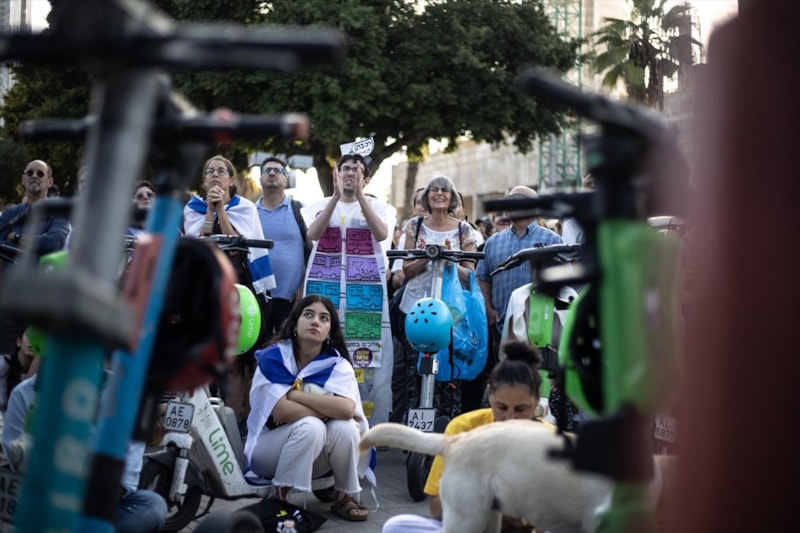 Filistin topraklarını gasbeden İsrailliler, Gazze'de yürürlüğe giren ateşkes anlaşması sonrası gerçekleşecek esir takasını Tel Aviv'de kurulan ekranlardan takip etti.