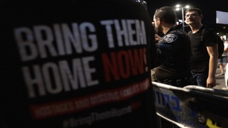 Yüzlerce kişilik İsrailli grup, "Katiller", "Hiçbir bedel esirler için çok değildir", "Artık yeter", "Refah'a saldırı=esirleri öldürmek" yazılı pankart ile afiş, döviz ve Gazze Şeridi'ndeki İsrailli esirlerin resimlerini taşıdı.