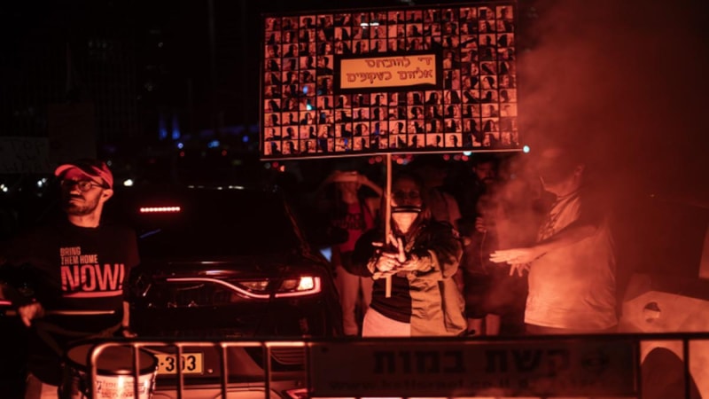 Esirlerin serbest bırakılması çağrısıyla pankart taşıyan göstericiler, "Hepsi hayata dönene, iyileşene veya İsrail mezarlarına gömülene kadar dinlenmeyeceğiz" sloganı attı.