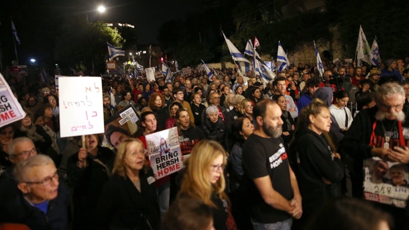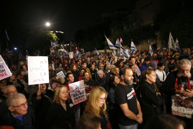 Esirlerin bir an önce evlerine dönmesi çağrısı yaparak davullar ve düdükler çalan protestocular, "Hepsi hemen eve!", "Yardım!" yazılı dövizler taşıdı, Netanyahu'yu suçlayan sloganlar attı. Göstericiler, "(Netanyahu) Bibi esirleri serbest bırak!", "Sen baştasın, sen suçlusun" diye bağırdı.