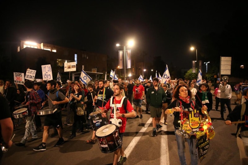 İsrail bayrakları taşıyan binlerce protestocu, Başbakan Netanyahu ve hükümetindeki siyasetçiler aleyhinde pankart, afiş ve dövizler taşıdı, caddede kurulan platformda hükümeti eleştiren konuşmalar yapıldı.