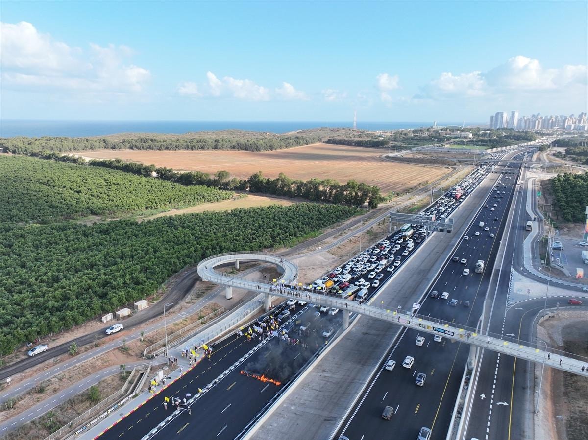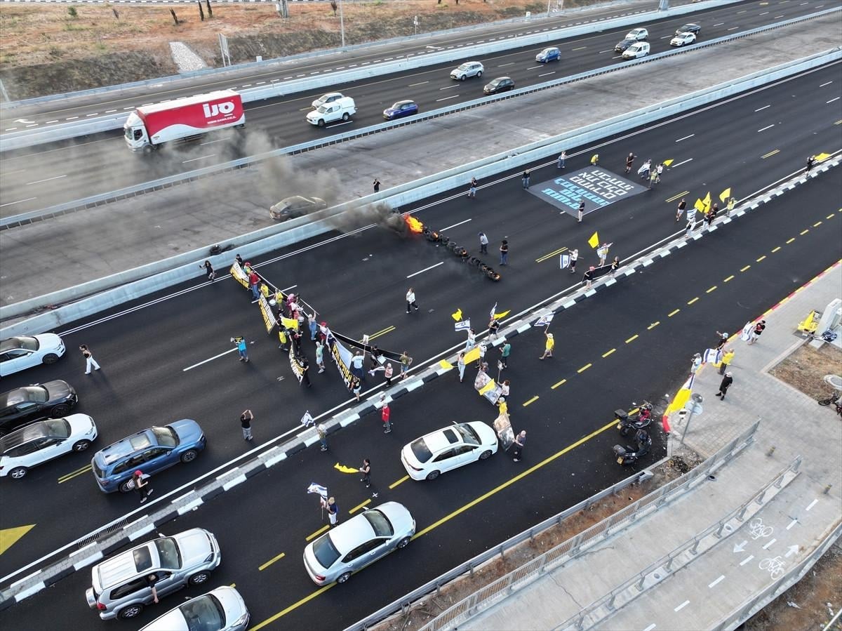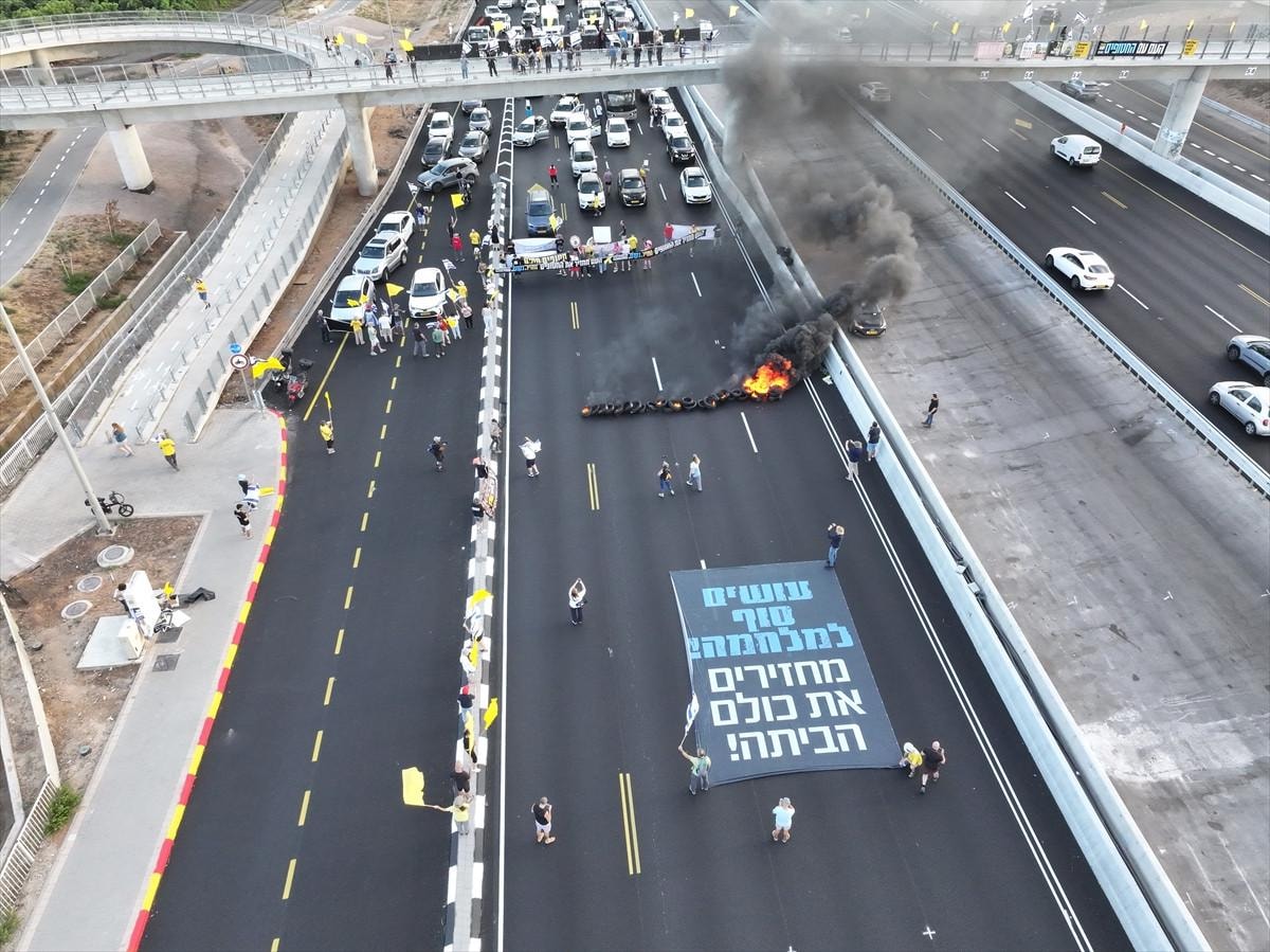 Göstericiler, ellerinde taşıdıkları pankartlarla Tel Aviv'deki 4. Cadde'yi trafiğe kapatarak Gazze’de bulunan İsraillilerin serbest bırakılması için anlaşmaya varılmasını talep etti.