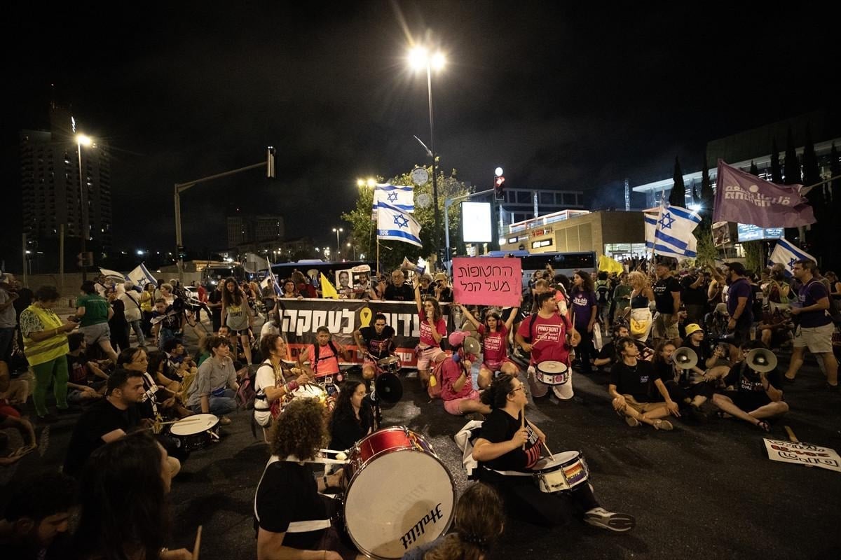 Davul, zil ve diğer müzik aletleriyle ritim tutan İsrailli göstericiler, "Anlaşma şimdi", "Seçimler şimdi", "Gazze'deki esirler çok bile kaldılar", "Hepsini geri getirin" sloganları attı.