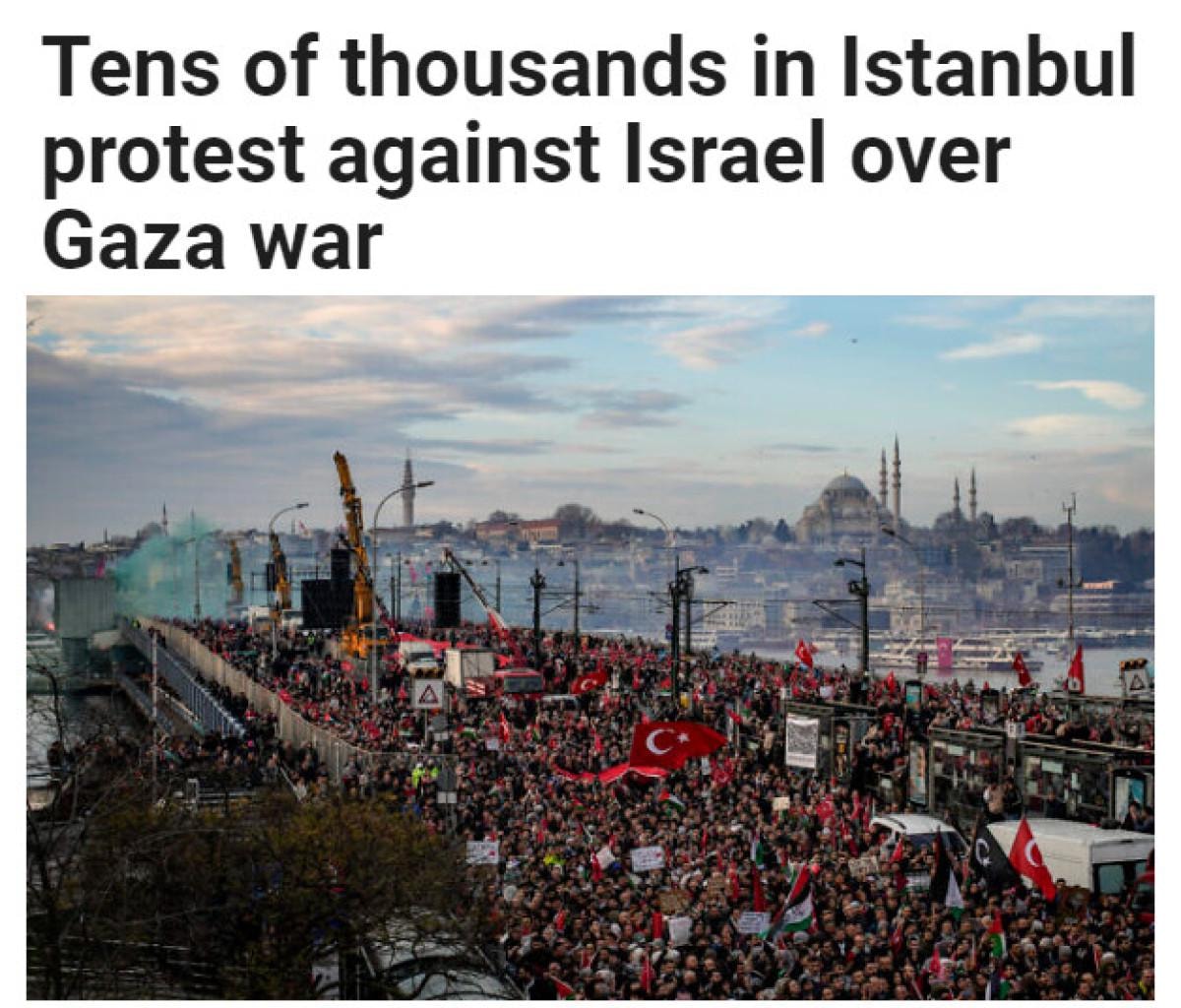 Haberde, "Türk ve Filistin bayraklarını sallayan protestocular, sloganlar atarak Boğaziçi'ndeki Galata Köprüsü'ne yürüdü." denildi.