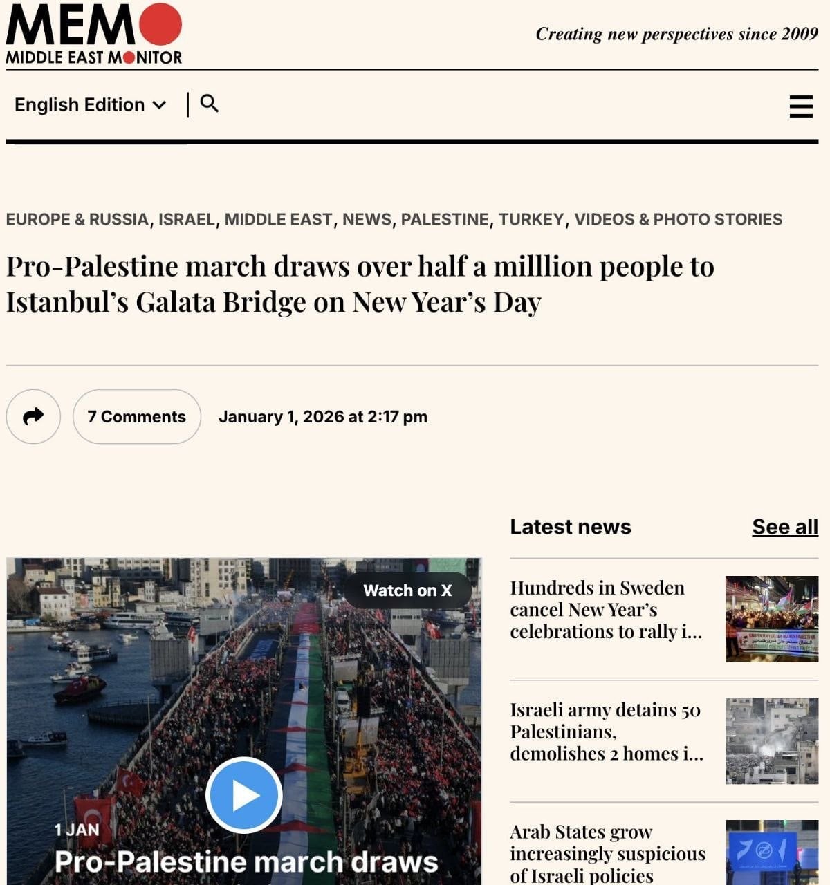"İstanbul'da, yılın ilk günü yarım milyon insan Gazze için adalet talep ederek ve İsrail'i saldırıları durdurmaya çağırarak yürüdü." diyen The New Arab gazetesi, Türkiye'yi İsrail'i en sert eleştiren ülkelerden biri olarak tanımladı.