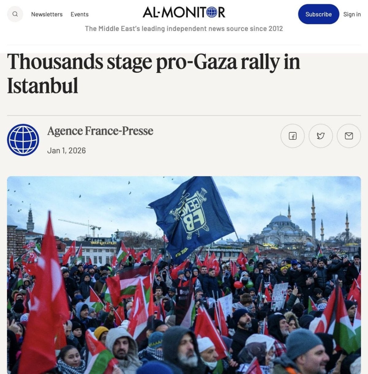Al Monitor haberinde, "Filistin ve Türk bayrakları sallayan binler, savaşın kırdığı topraklarda şiddetin sona ermesi için bir araya geldi." ifadelerini kullandı.