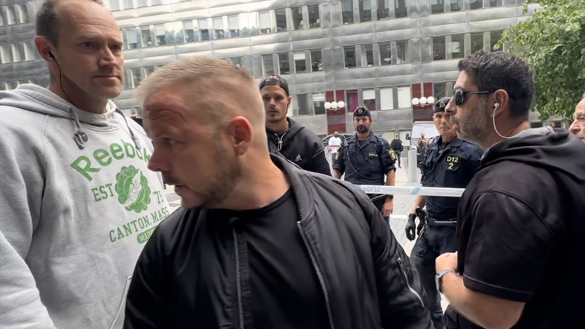 Başkent Stockholm'de Irak asıllı Momika'nın Sergelstorg Meydanı'nda Kur'an-ı Kerim'i yakmasını eleştirerek güvenlik şeridinin arkasında bağıran İsveçli Tovivanen'i sivil polis, susturarak olay yerinden uzaklaştırdı.