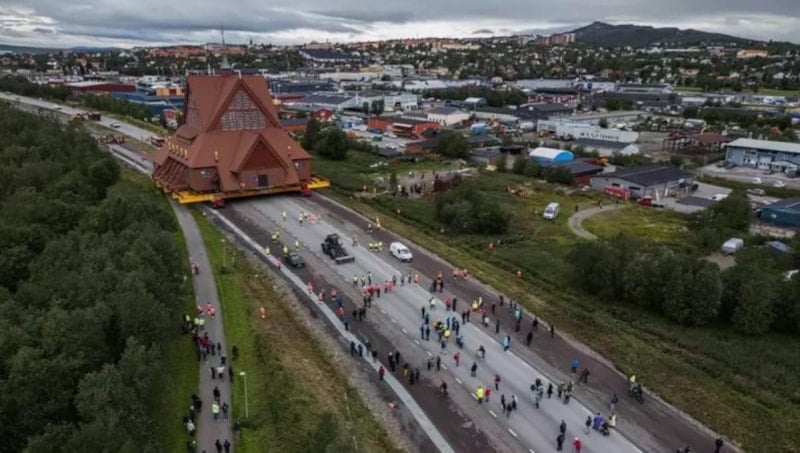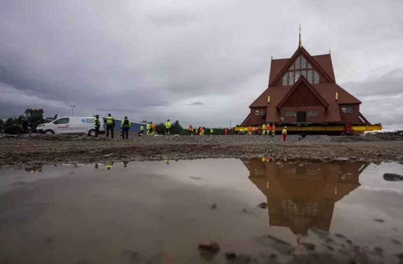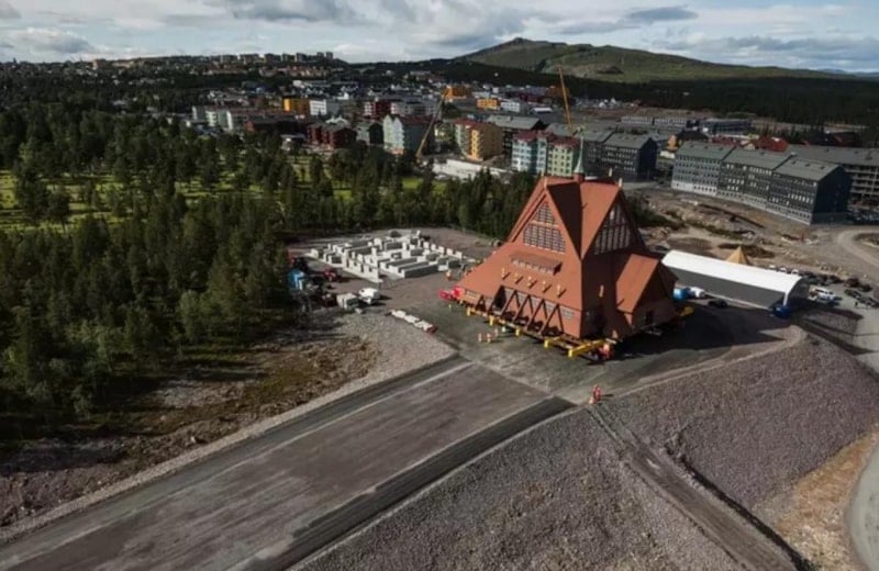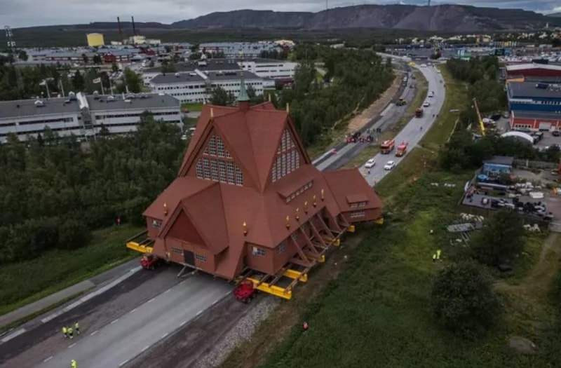 İsveç’in Kiruna kentinin simgesi haline gelmiş 113 yıllık ahşap kilise, toprak kayması tehlikesi nedeniyle 5 kilometre uzaklıktaki yeni yerine taşındı. 672 ton ağırlığındaki yapının taşınması sırasında dev tekerlekli platformlar kullanıldı ve kilise saatte yaklaşık yarım kilometre hızla ilerledi.