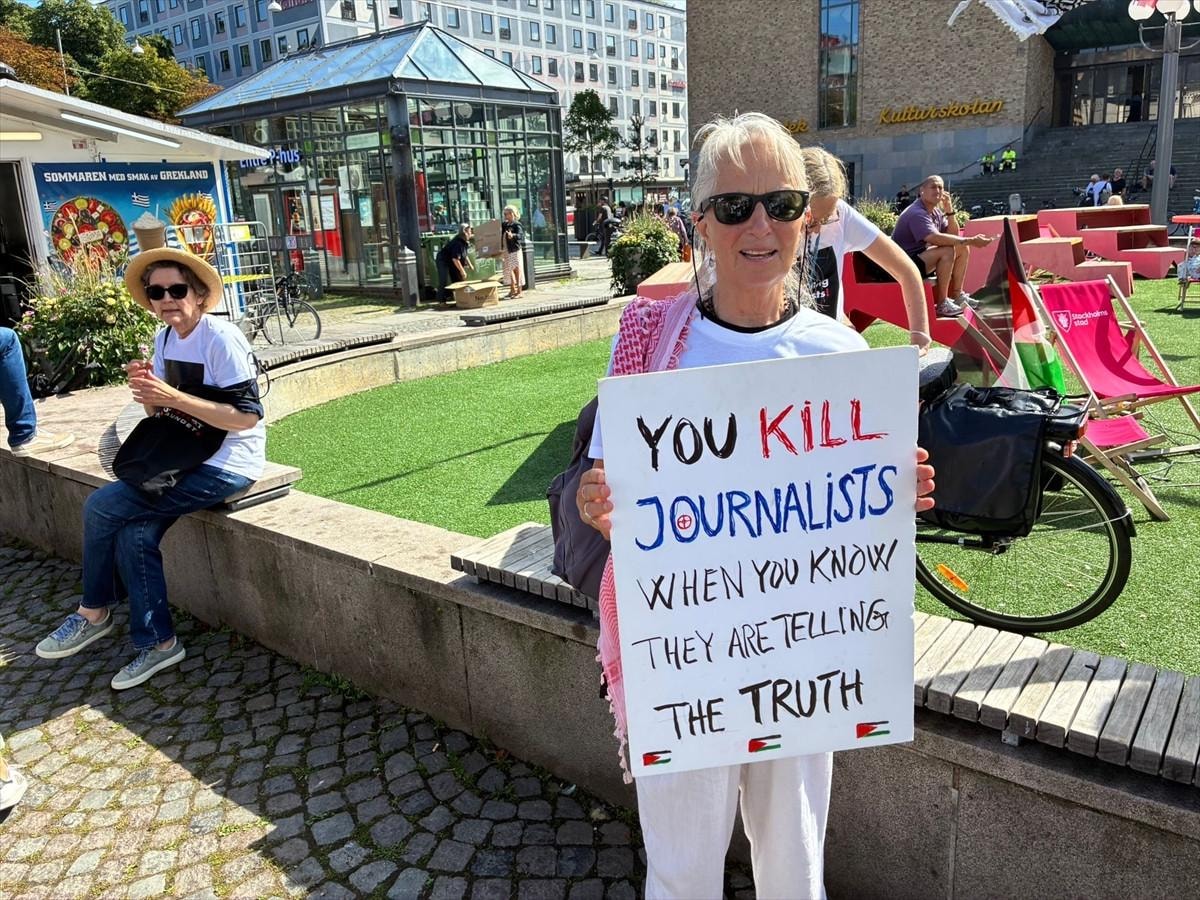 İsveç Gazeteciler Federasyonu tarafından organize edilen eylem kapsamında İsveçli gazeteciler, Al Jazeera muhabiri Enes eş-Şerif başta olmak üzere Gazze'de öldürülen gazetecileri anmak için Medborgarplatsen Meydanı'nda bir araya geldi.