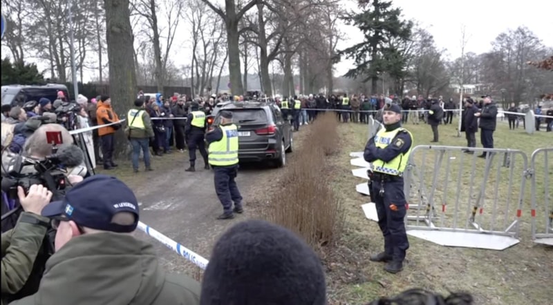 Büyükeçilik önüne gelen Paludan'ın etrafında İsveç polisi tarafından güvenlik çemberi oluşturuldu.