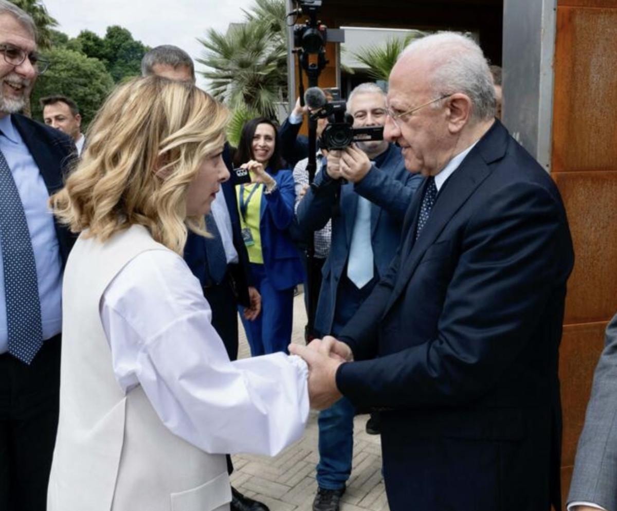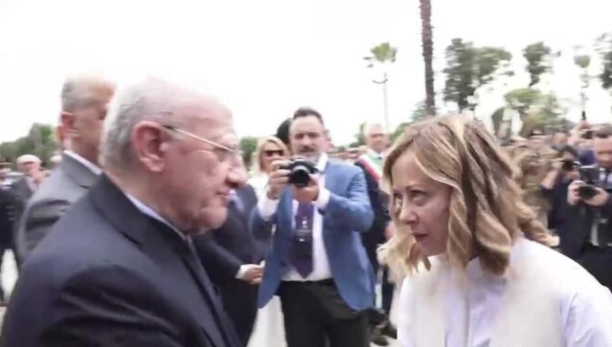 Buna göre Meloni, açılışta kendisine şubat ayında İtalya Temsilciler Meclisi'nde "Önce sen çalış, o...pu " diye küfreden Campania Bölge Başkanı De Luca ile yüzleşti.