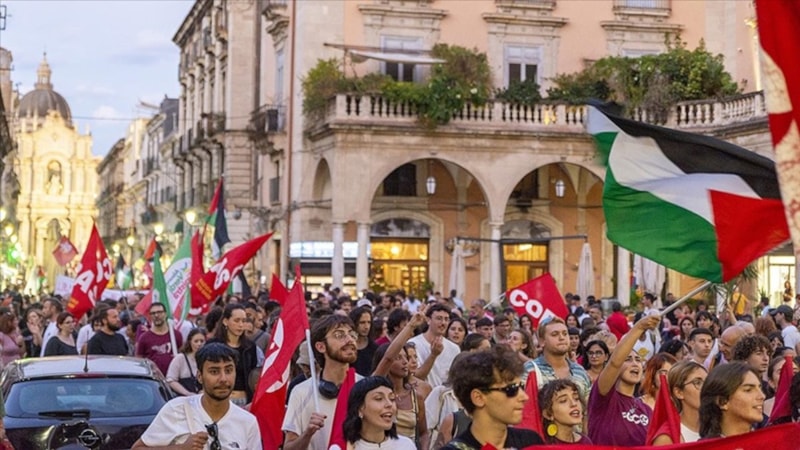İtalya’dan Küresel Sumud Filosu’na katılacak teknelerin buluşma noktalarından Sicilya Adası’nın Katanya Limanı’nda toplanan binlerce kişi, ellerindeki Filistin bayrakları ve filoya destek mesajları içeren dövizlerle şehir merkezine yürüdü.