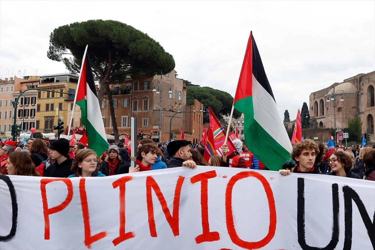 Grev nedeniyle CGIL, Esquilino Meydanı'ndan Imperiali Caddesi'ne kadar bir yürüyüş düzenledi. Yürüyüşte göstericiler, "Yanlış bütçe" pankartıyla yürürken, bazı göstericiler Filistin bayrağı taşıdı.