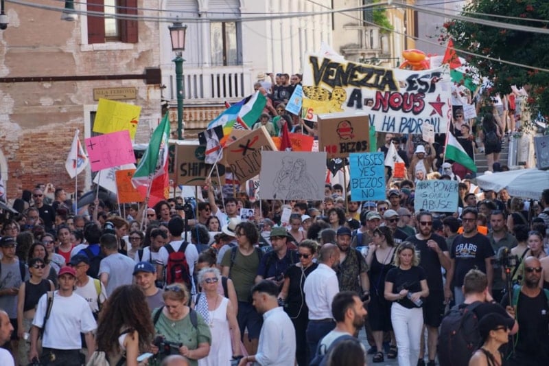 Bezos çiftinin düğün töreninin son gününde yüzlerce protestocu, "düğün şatafatına hayır" demek için Venedik'in merkez sokaklarında yürüyüş düzenledi.
